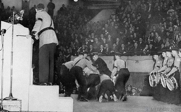 Штурмовики усмиряют враждебно настроенного мужчину внутри здания «Мэдисон-сквер-гарден» (20 февраля 1939 года). Впоследствии полиция спасла и арестовала его. Зачинщиком беспорядка оказался двадцатишестилетний работник отеля Изадор Гринбаум. На фотографии выше на трибуне стоит Фриц Кун, лидер Германо-американского союза. Гринбаум прервал его речь, посвящённую обличению евреев