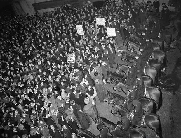 Конная полиция Нью-Йорка образовала сплошную защитную линию за пределами «Мэдисон-сквер-гарден», чтобы не дать толпе проникнуть внутрь здания, где Германо-американский союз проводил свой митинг. Чтобы предотвратить столкновения между членами союза и антифашистскими демонстрантами, комплекс поручили охранять 1500 полицейских (20 февраля 1939 года)