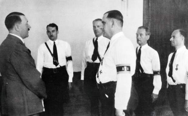 Фриц Кун, лидер Германо-американского союза (слева), и его коллеги свидетельствуют своё почтение канцлеру Германии Адольфу Гитлеру во время визита в Берлин