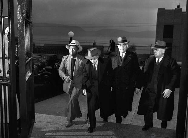 В 1939 году лидер Германо-американского союза Фриц Кун был осуждён за растрату имущества и отправлен в тюрьму. Пока он там находился, его гражданство было аннулировано. Позднее его перевели в федеральный лагерь в Техасе для иностранных преступников. В 1945 году Куна депортировали в Германию. На фотографии выше Кун (третий слева), прикованный наручниками к двум другим заключённым, входит в здание тюрьмы Синг-Синг в Оссининге (штат Нью-Йорк) 6 декабря 1939 года. Заключённых сопровождает шериф округа Нью-Йорк, Мэтью Ларкин (справа)